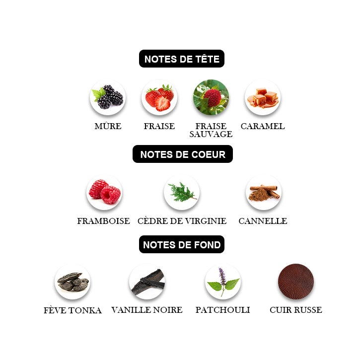 Un élixir gourmand et charnel où la mûre juteuse, la fraise éclatante et la fraise sauvage se fondent dans la douceur dorée du caramel.