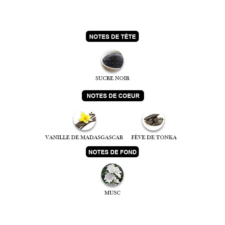 La vanille de Madagascar et la fève tonka se mêlent avec sensualité, avant de s’épanouir sur un musc velouté et addictif.