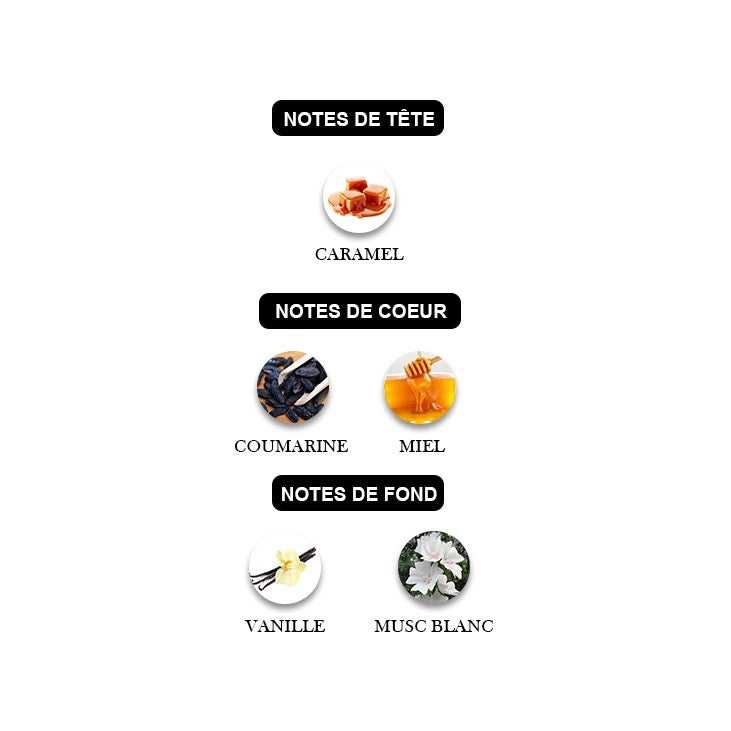 En fond, la richesse veloutée de la vanille se combine à la douceur aérienne du musc blanc, pour un sillage tendre, sensuel et délicieusement addictif.